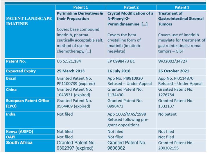 La siguiente gráfica muestra tres patentes diferentes en relación con el medicamento oncológico Imatinib, creado por Novartis. Se observa que, inicialmente se presentó una solicitud sobre una sal, luego sobre una modificación cristalina y finalmente una sobre su utilización en el tratamiento de tumores gastrointestinales. En la tabla se observa que la aplicación de los requisitos de patentabilidad varía de un estado a otro. Mientras que, en la Oficina Europea de Patentes, en la SIPO y en la Oficina de Patentes Sudafricana, se han concedido las tres patentes, lo cual retrasará el lanzamiento de genéricos, en otros países como Kenia, no se han presentado solicitudes de patente y en la India y Brasil se han denegado la mayoría.