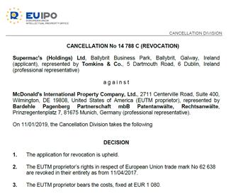 En tanto que todas las pruebas aportadas por McDonald’s fueron rechazadas, se llegó a la situación de que el gigante del fast food no había aportado una prueba de uso efectiva de la marca. En consecuencia, la EUIPO resolvió que no existía acreditación del uso genuino de la marca BigMac en el territorio europeo en el periodo 2012-2017, dando la razón a Supermac’s y decretando la cancelación de la marca.