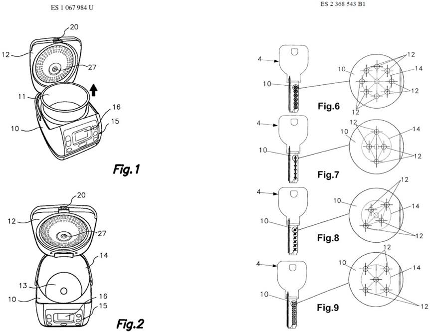 Algunos dibujos de un robot para cocción de alimentos de Taurus (izquierda, Modelo de Utilidad ES 1 067 987 U), y de una patente de Tesa relativa a uno de sus productos, una llave de cerradura de seguridad (derecha, patente ES 2 368 543 B1; cortesía de la base de datos Invenes).
