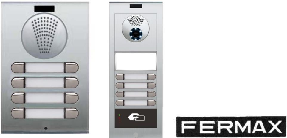 Imágenes de los Diseños de “FERMAX” sobre aparatos de videotelefonía (Diseños europeos 160 404, izquierda y centro, cortesía de la base de datos DSView) y de una de sus Marcas (española M 1199482, y europea EM 741835, derecha; base de datos TMView).
