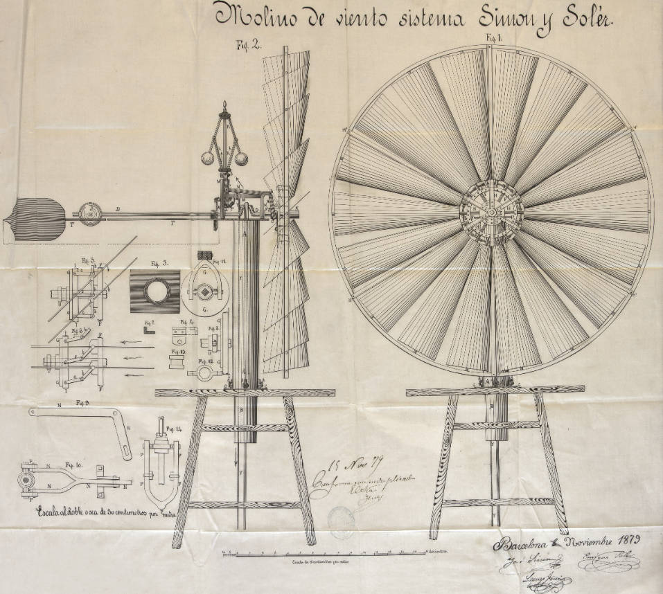 La tercera patente relacionada con la energía eólica, se presenta dentro del marco de la Ley de Patentes de 1878 por José Simón Suriñach y Enrique Soler Camp, para un molino de viento, que en realidad es un aeromotor. Estas tipologías de molinos se presentaron, curiosamente en España en una época anterior a su registro en Estados Unidos, donde sí tuvieron mayor explotación que en España a partir de 1888 con la empresa Aermotor Company.