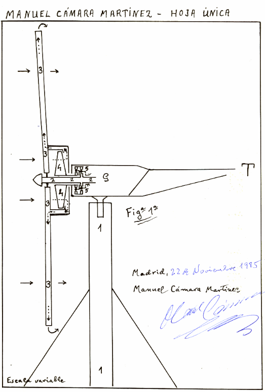 La quinta patente se presenta a raíz de la Ley de Patentes de 1986, que incluyó la legislación de propiedad industrial española dentro del marco de la Comunidad Económica Europea, que vino a sustituir la longevo Real Decreto-Ley de 1929. Fue presentada por Manuel Cámara Martínez, para un aerogenerador, que según el Diccionario de la Real Academia de la Lengua son aparatos que transforman la energía eólica en energía eléctrica mediante rotores de palos. Habrá que esperar a la década de los años 90 para que el gobierno comience a subvencionar programas de investigación para facilitar el desarrollo de esta tipología de patentes, sin embargo, en esta década empieza la crisis de las centrales termohidroeléctricas y las nucleares, como consecuencia de la crisis del petróleo de la década de los años 70 y las protestas contra la energía nuclear surgidas tras el accidente de Chernóbil en los años 80.