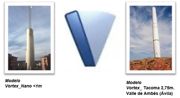 • Vortex Tacoma.– Altura: ~2.5m, peso: 14Kg, velocidad nominal: 9m/s, potencia nominal: ~100W. Aplicaciones semejantes a las de un panel solar. Ideal para ser ubicado en tejados combinado o no con paneles solares.