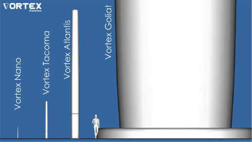 • Vortex Nano.- Altura: 85cm, peso:1.7Kg, velocidad nominal: 5m/s, potencia nominal <2W. Desarrollado como prueba de concepto de la tecnología o mínimo producto viable de la tecnología. Orientado aplicaciones de señalización LED, pequeños sensores y ámbito académico.