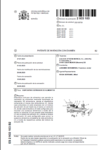 COCUUS tiene actualmente en vigor una patente española (ES2933103B2) que tiene por objeto de protección un dispositivo extrusor de alimentos, el cual permite la impresión 3D de alimentos a gran velocidad para conseguir producir estos alimentos a escala industrial.