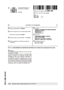 Actualmente, el CSIC mantiene en vigor una patente en España (ES2369102B1) concerniente a un procedimiento de obtención de productos cárnicos con algas, mediante la incorporación de algas y complementariamente con la reducción de los niveles de sodio y/o una mejora en el perfil lipídico provocado por la sustitución de grasa animal por otra de origen vegetal y/o marina.