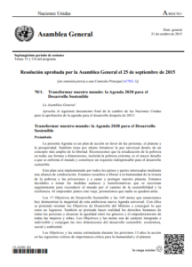Por esta razón, tras un período de más de quince años de maduración por parte de la comunidad internacional sobre los problemas más destacados que obstaculizaban un desarrollo global, sostenible e igualitario, el 25 de septiembre de 2015, la Asamblea General de la Organización de las Naciones Unidas (ONU), reunida en su Sede en Nueva York coincidiendo con su septuagésimo aniversario, aprobó la resolución 70/1, “Transformar nuestro mundo: la Agenda 2030 para el Desarrollo Sostenible”. En ella se reconocía que el mayor desafío del mundo actual es erradicar la pobreza al tiempo que afirmaba que sin su eliminación el desarrollo sostenible es imposible.