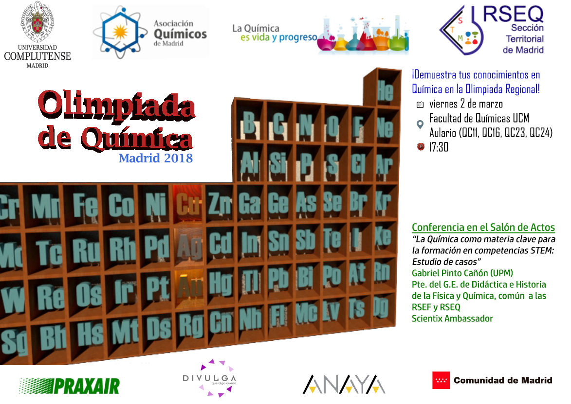 La fase local de la Olimpíada de Química tendrá lugar el viernes 2 de marzo de 2018, a las 17:30 h, en el edifico C de la Facultad de Ciencias Químicas de la Universidad Complutense de Madrid, Ciudad Universitaria, s/n, 28040-Madrid, en convocatoria única para todos los centros de la Comunidad de Madrid adscritos a las Universidades de Alcalá, Autónoma de Madrid, Carlos III, Complutense, Politécnica y Rey Juan Carlos.