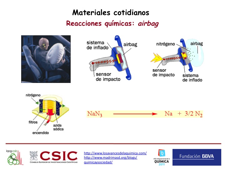 En la página web de RTVE «EL PORQUÉ DE LAS COSAS«, América Valenzuela explica el funcionamiento del airbag, que se basa en la descomposición de la azida sódica, un compuesto termodinámicamente estable, pero inestable cinéticamente (es decir, reactivo en ciertas condiciones) cuando se calienta, golpea o presiona, generando nitrógeno. La reacción es exotérmica (desprende calor) y en ella se genera un gas (nitrógeno) a partir de un sólido (azida sódica), aumentando considerablemente el volumen.