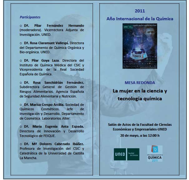 Dentro de las numerosas actividades que la UNED ha programado con motivo del Año Internacional de la Química, el próximo día 20 de mayo celebrará una mesa redonda con el tema La mujer en la ciencia y la tecnología química.