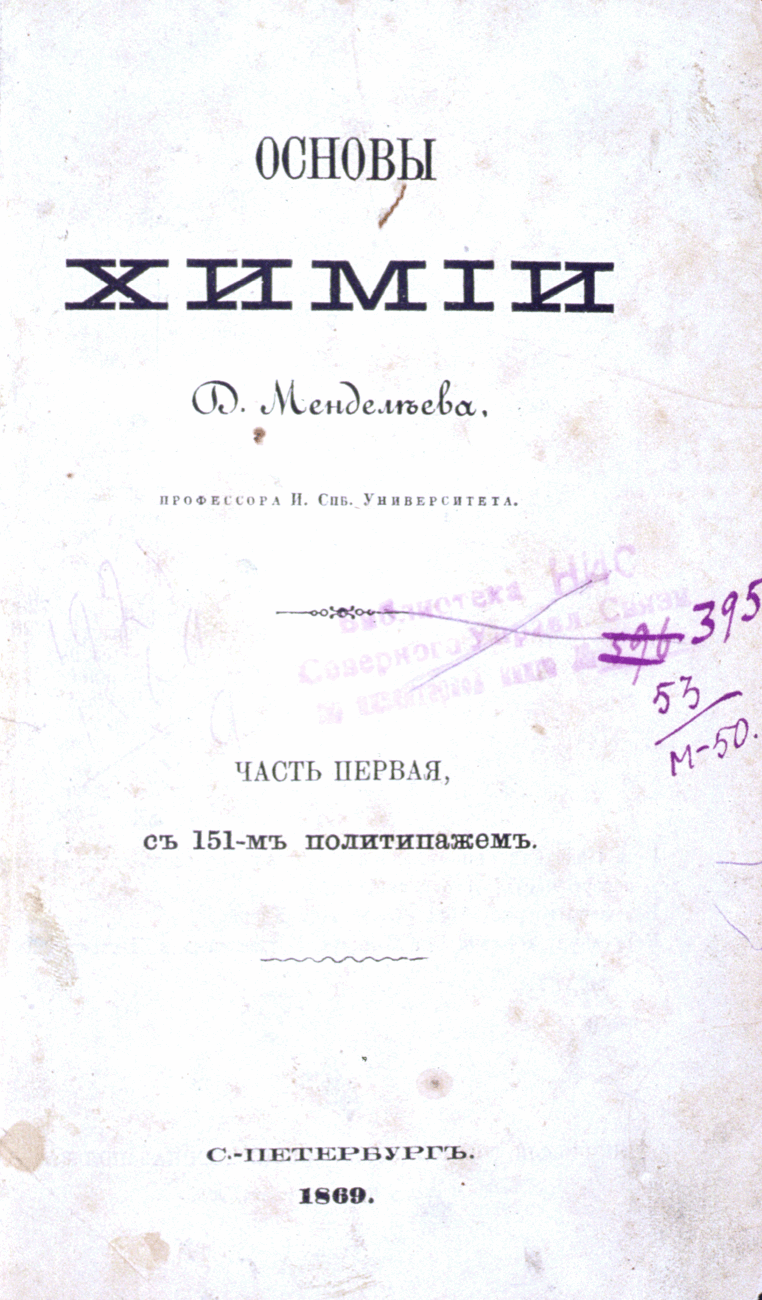 En su artículo (J. Russ. Chem. Soc., 1869, 1, 60) y en su libro de texto (Principles of Chemistry, 1869), Mendeleev desarrolló su tabla periódica ordenando los 62 elementos conocidos en la época de acuerdo con su peso atómico, pues aún no se conocía el número atómico. Mendeleev dejó cuatro huecos para elementos que predijo que se descubrirían posteriormente y predijo sus propiedades físicas y químicas.