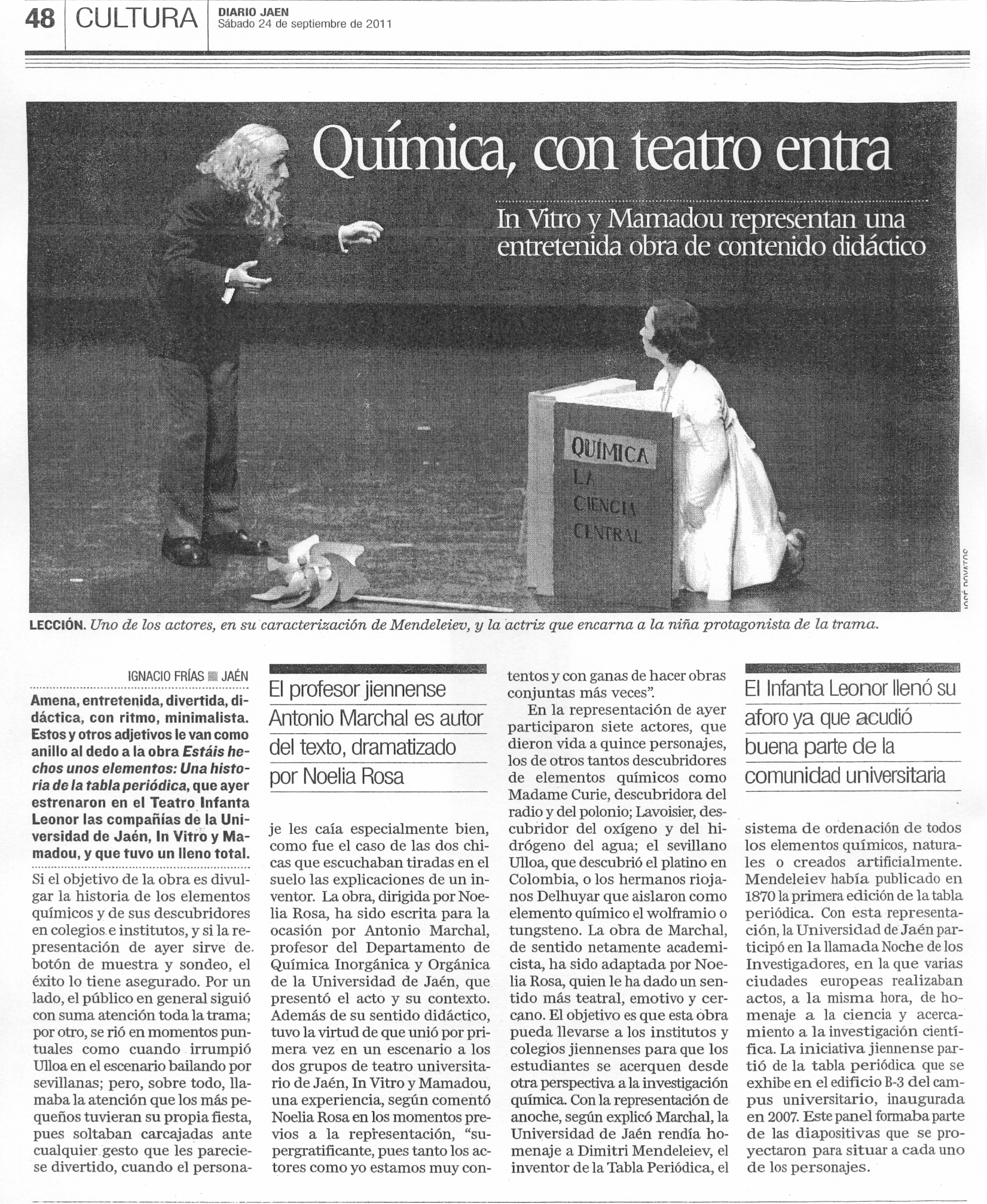 La obra se estrenó el 25 de septiembre de 2011 coincidiendo con la Noche de los Investigadores, siendo un éxito, como lo recogieron los periódicos locales (http://diariodigital.ujaen.es/node/25933, ver imagen de la noticia más abajo). La obra de teatro constituyó una de las actividades más originales durante el Año Internacional de la Química.