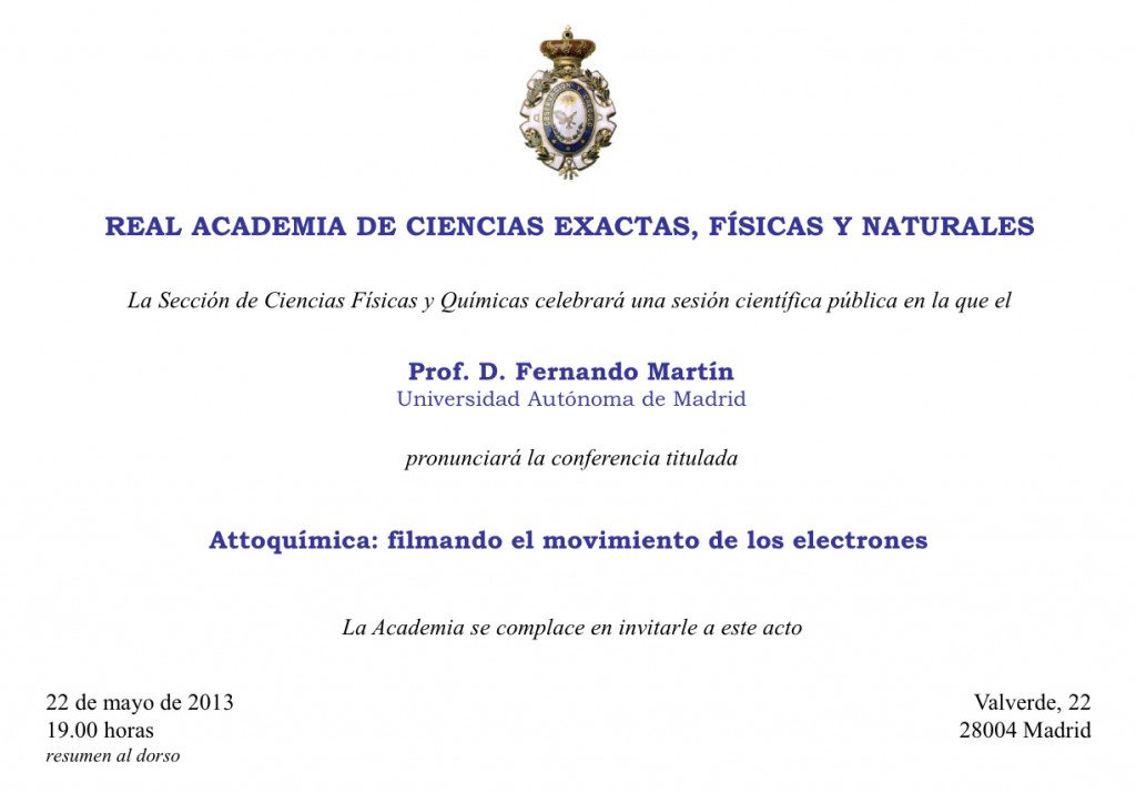 El próximo día 22 de mayo, el profesor Fernando Martín (Universidad Autónoma de Madrid) impartirá una conferencia en la Real Academia de Ciencias Exactas, Físicas y Naturales sobre los recientes avances tecnológicos que han llevado a la producción de láseres de attosegundos y las primeras aplicaciones, tanto teóricas como experimentales, al estudio del movimiento de los electrones en átomos y moléculas, con especial énfasis en aquellas que han sido desarrolladas en su grupo (XCHEM) de la UAM.