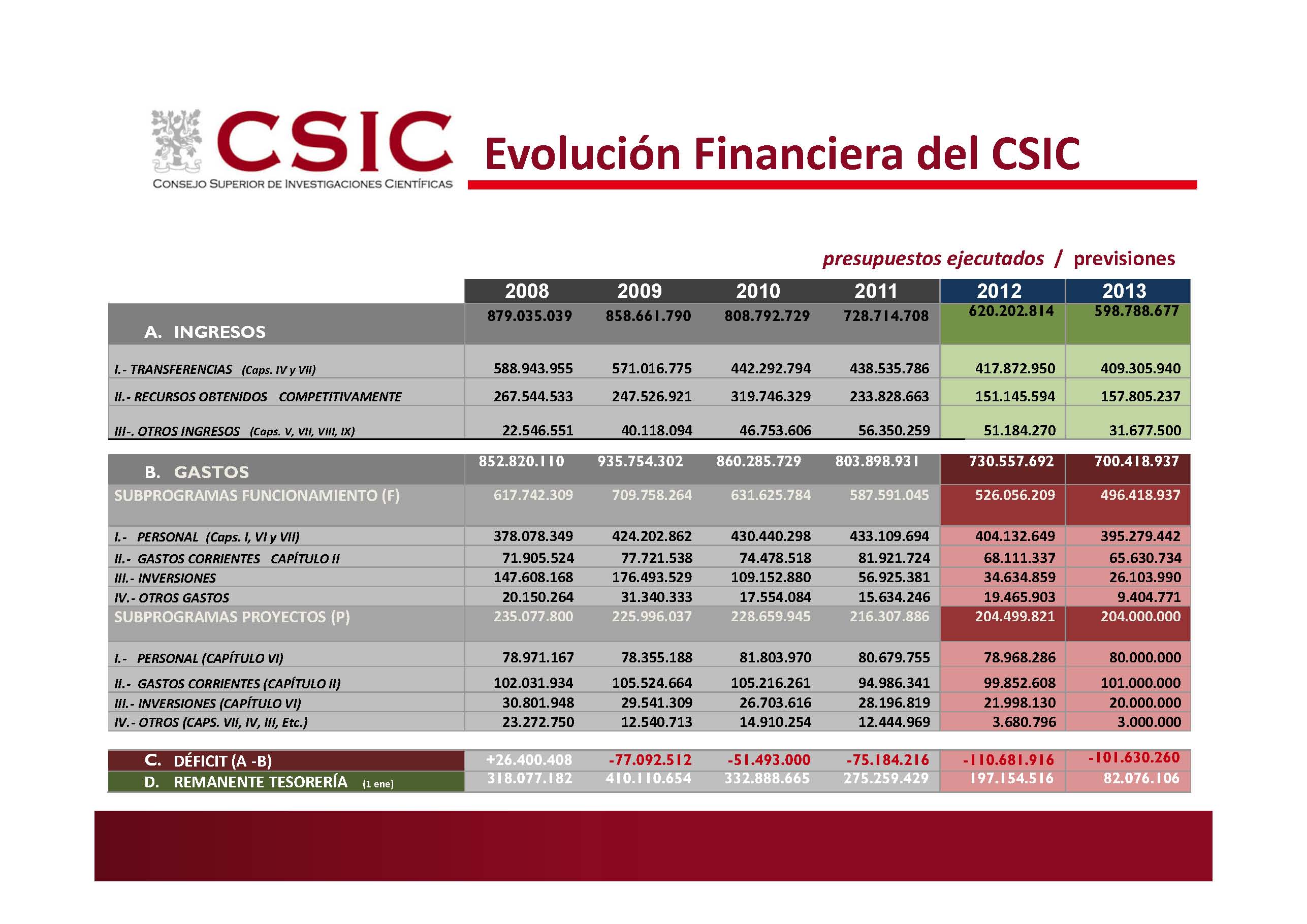 En los años más prósperos (al final de la primera legislatura del Gobierno de Zapatero en 2008), el presupuesto del CSIC llegó a ser de más de 879 millones (M) de euros, de los que 589 M € procedían de los Presupuestos Generales del Estado (PGE), con 268 M € procediendo de financiación que los investigadores habían conseguido en convocatorias competitivas (Plan Nacional, Proyectos Europeos, Fundaciones) y en contratos con empresas. En aquel año 2008, el remanente de tesorería fue de 318 M €. En 2009, la situación se mantuvo muy similar y el remanente ascendió a más de 410 M €. Esta situación contrasta con las cuentas presentadas por el Secretario General en pasado 9 de julio: el presupuesto del CSIC en 2013 es de 599 M € (280 M € menos que hace 5 años), de los que 409 M € proceden de los PGE (189 M € menos que en 2008) y 158 M € de proyectos diversos (110 M € menos que en 2008); y los remanentes se han reducido hasta 82 M €. Puesto que los remanentes son cantidades que los investigadores y los institutos han ido acumulando durante muchos años, resulta que el CSIC se ha gastado 328 M € de nuestros ahorros y con la medida adoptada hace unos días, que explicaba en el primer párrafo de este apartado, se piensan gastar los 82 millones que quedan. Una situación lamentable.