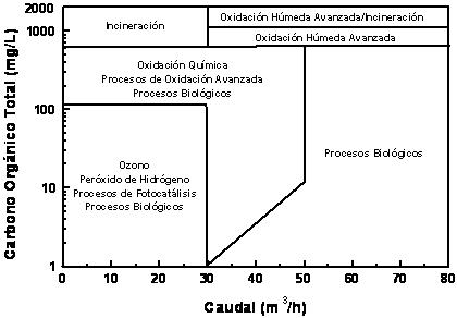 El tratamiento y reutilización de aguas residuales urbanas e industriales es una opción que viene tomando importancia en zonas de recursos hídricos escasos, lo que obliga a la mejora de las tecnologías de tratamiento. Las aguas residuales industriales tienen entre sus características habituales la presencia de contaminantes orgánicos resistentes a la degradación por vía química y tóxicos para el desarrollo de la actividad de los microorganismos en tratamientos biológicos convencionales. Este es el caso de contaminantes tales como compuestos aromáticos (fenoles y clorofenoles), plaguicidas clorados (PCB´s), aril y alquilsulfonatos (detergentes) e hidrocarburos lineales. Algunas tecnologías denominadas avanzadas se han dirigido a la utilización de procesos de oxidación química, los cuales permiten la mineralización de estos contaminantes a dióxido de carbono y agua o su transformación hacia otros productos de menor toxicidad que resulten más fácilmente biodegradables. En la Figura 1 se muestra el intervalo de aplicación de las diferentes tecnologías de tratamiento de aguas residuales dependiendo del caudal de tratamiento y de la carga orgánica. Se observa que los procesos de oxidación biológica resultan los más versátiles en el tratamiento de aguas residuales industriales, tanto en intervalo de caudal a tratar como en concentración de materia orgánica (hasta 600 ppm de carbono orgánico total).