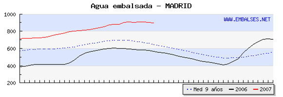 En el gráfico adjunto se presenta el agua embalsada en la Comunidad de Madrid comparativamente con la correspondiente a la del año 2006 y la media de los años anteriores (http://www.embalses.net/provincia-45-madrid.html)