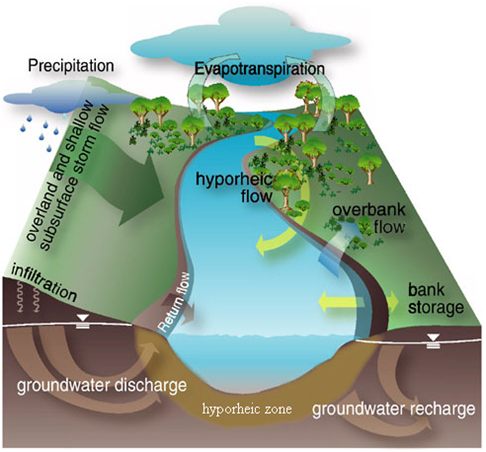 Figure. 1. Major pathways of water movement emphasizing (1) groundwater flow, (2) overland flow and shallow subsurface flow from adjacent uplands, and (3) instream water sources such as overbank flow, bank storage and hyporheic exchange (http://books.nap.edu).