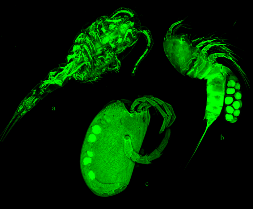 Figure 2. Hyporheic fauna. a – Diacyclops sp. (Cyclopoida, Copepoda), b – Harpacticoida (Copepoda), c – Frontipodopsis reticulatifrons (Acarina) (Confocal microscopy images performed at Museo Nacional de Ciencias Naturales, Madrid, by Sanda Iepure and Antonio Valdecasas, MNCN, Madrid).