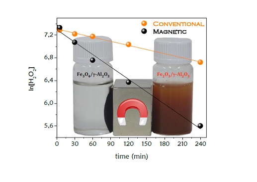 Los catalizadores desarrollados hasta el momento fundamentalmente se basan en hierro depositado como oxido de hierro (III). En este trabajo se han desarrollado catalizadores soportados en los que el hierro se encuentra como un oxido mixto de hierro (II) y (III), es decir, como magnetita. Esta circunstancia permite una fácil recuperación por su carácter magnético, facilitando su utilización en polvo en el tratamiento de aguas, y por lo tanto, evitando posibles limitaciones difusionales tanto internas como externas. Como se puede observar en la Figura 1, estos catalizadores son fácilmente orientables bajo un campo magnético, pudiendo ser retenidos en el reactor con ayuda de un imán mientras este se vacía del agua tratada. Por otro lado, la presencia de hierro (II) en la superficie acelera la formación de radicales hidroxilo y, por lo tanto, la velocidad de descomposición de H2O2 en relación a los catalizadores convencionales.