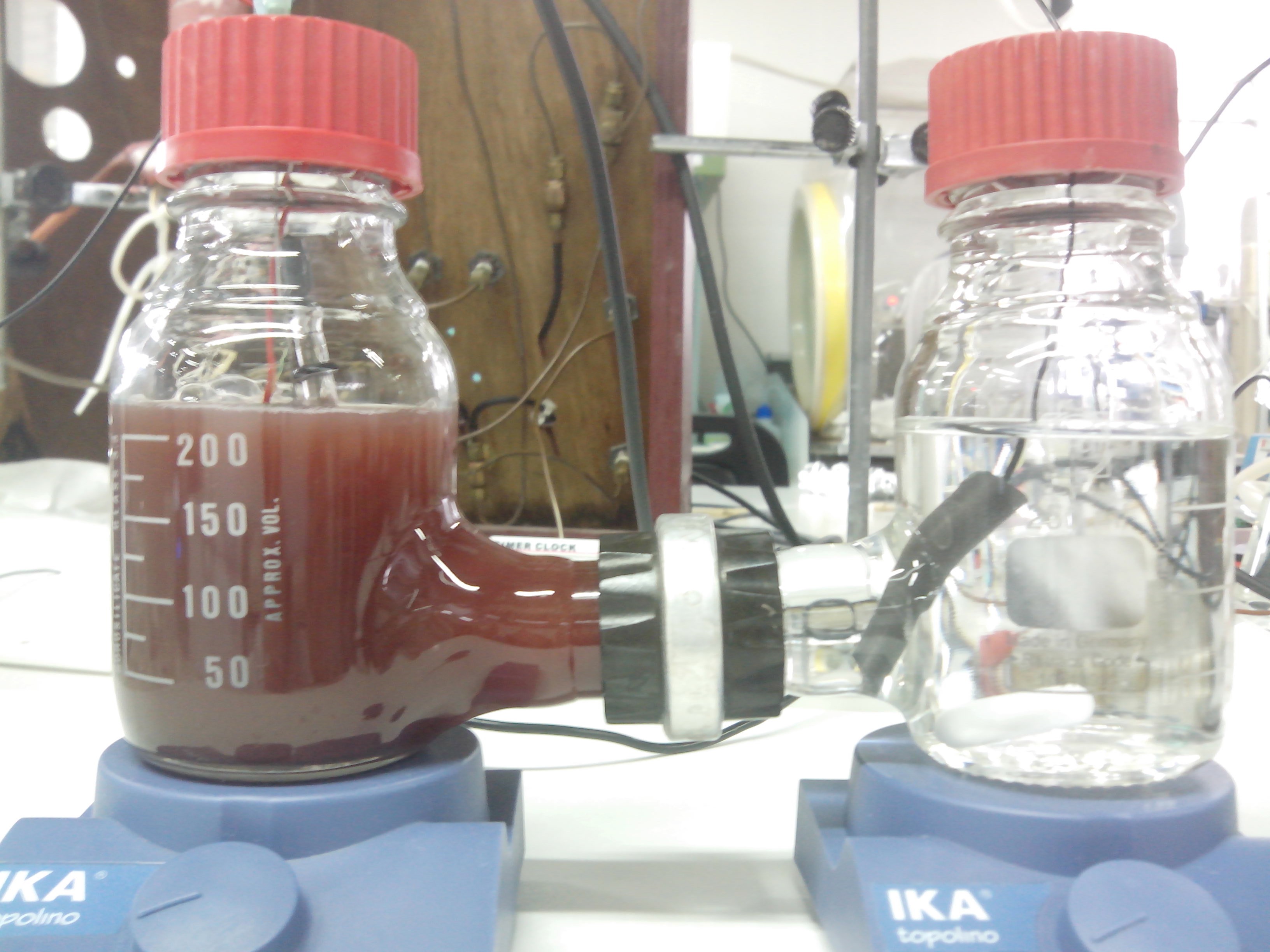 Figura 5. Celda en H con cultivo de PPB en la cámara izquierda y medio sin microorganismos en la celda derecha.