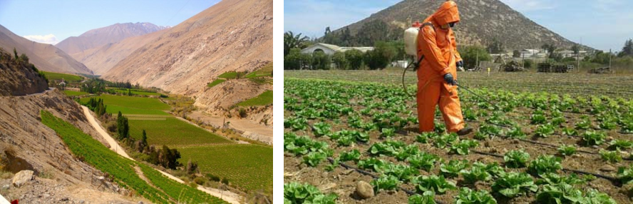 La agroindustria de la región de Coquimbo emplea grandes cantidades de pesticidas, herbicidas y fertilizantes, que son peligrosos para la calidad del agua en la cuenca (Fig. 4). Los estudios actuales indican que las aguas superficiales de la cuenca de Choapa tienen una alta concentración de zinc, cobre y plomo, pero también compuestos orgánicos tales como hidrocarburos aromáticos policíclicos, herbicidas, pesticidas y fungicidas. Actualmente, el seguimiento de los acuíferos está asegurado a nivel nacional por la DGA y Las Juntas de Vigilancia; mientras que el análisis de la calidad de las aguas se centra en una serie de parámetros básicos utilizados para la caracterización de los acuíferos. Aunque se vigila el contenido en metales pesados de los acuíferos debido a la intensa actividad minera de la zona, los contaminantes provenientes de la agricultura aún no se han considerado para la evaluación de la calidad del agua subterránea.