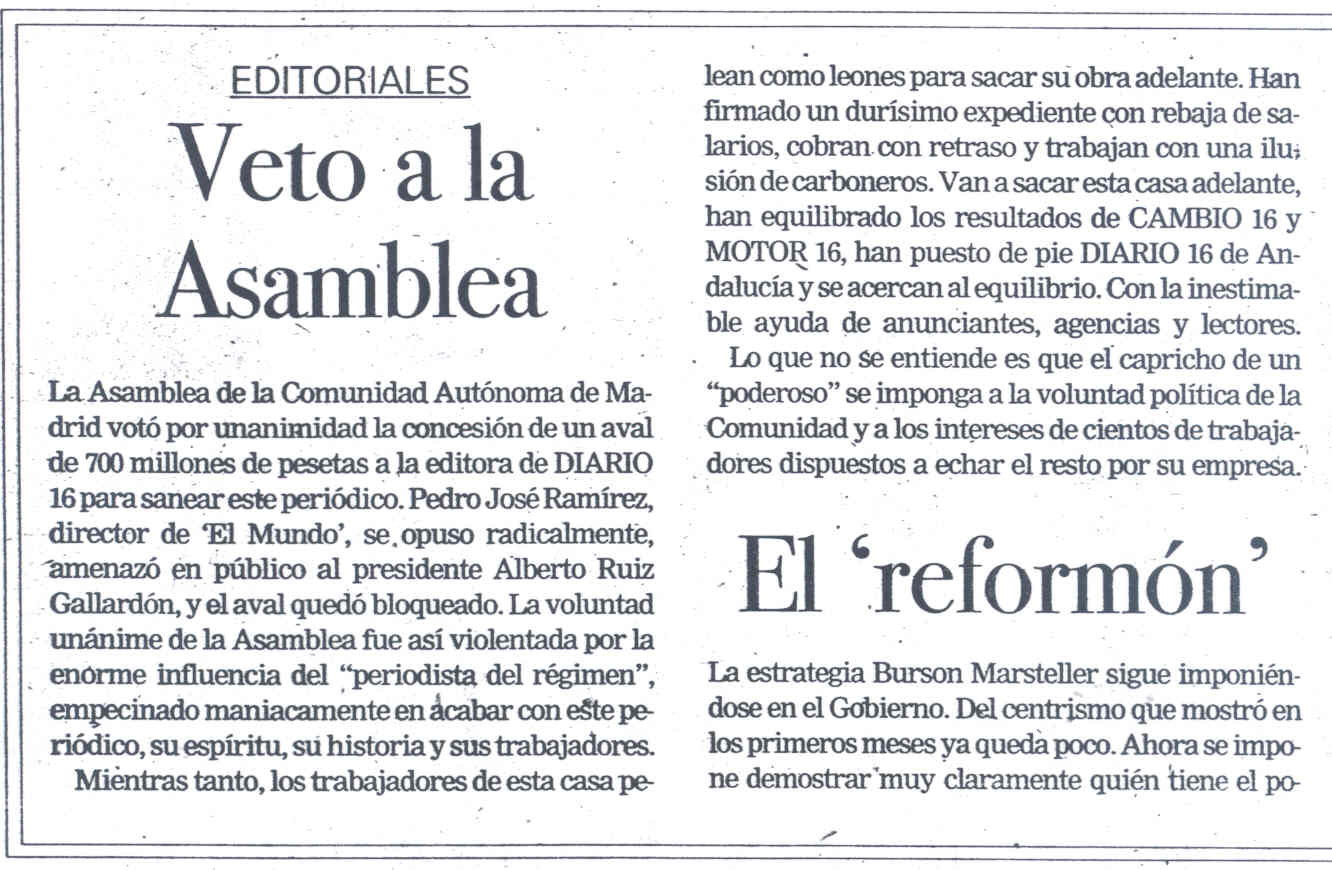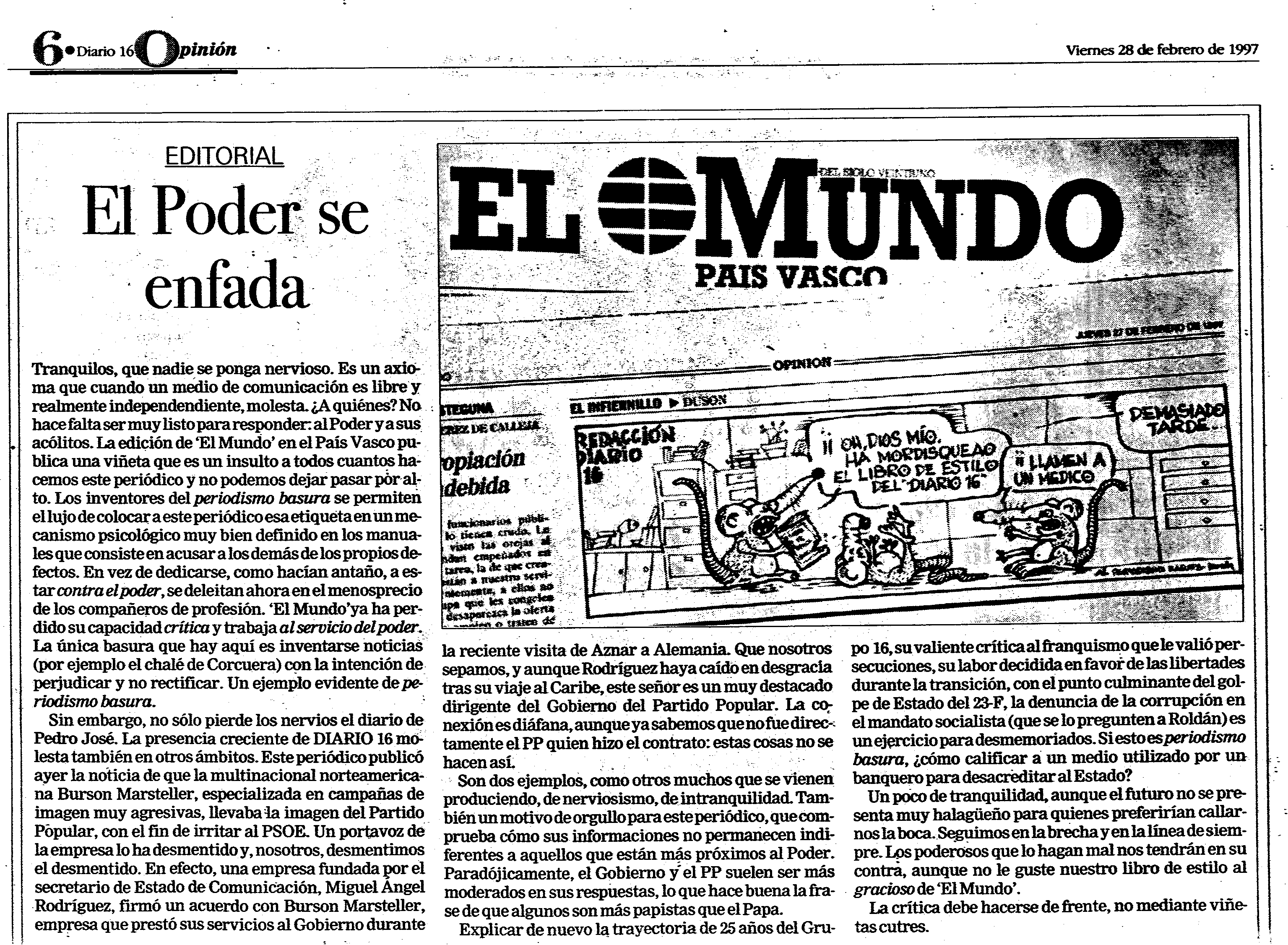 En este panorama bipolar, trata de sobrevivir un diario que se forjó en la transición democrática, como era “Diario 16”,  y que en esta época se convierte en un outsider. Medios como ABC siguen cumpliendo su tradición de apoyo a la derecha. “El Mundo” pasa de ser un medio de oposición, azote del anterior gobierno socialista, a sostener al gobierno de Aznar. “El País”, aunque más próximo a las posturas defendidas por el PSOE y el “centro liberal-progresista”, muestra ciertas simpatías por el presidente Gallardón, y le apoya como alternativa posible a Aznar.