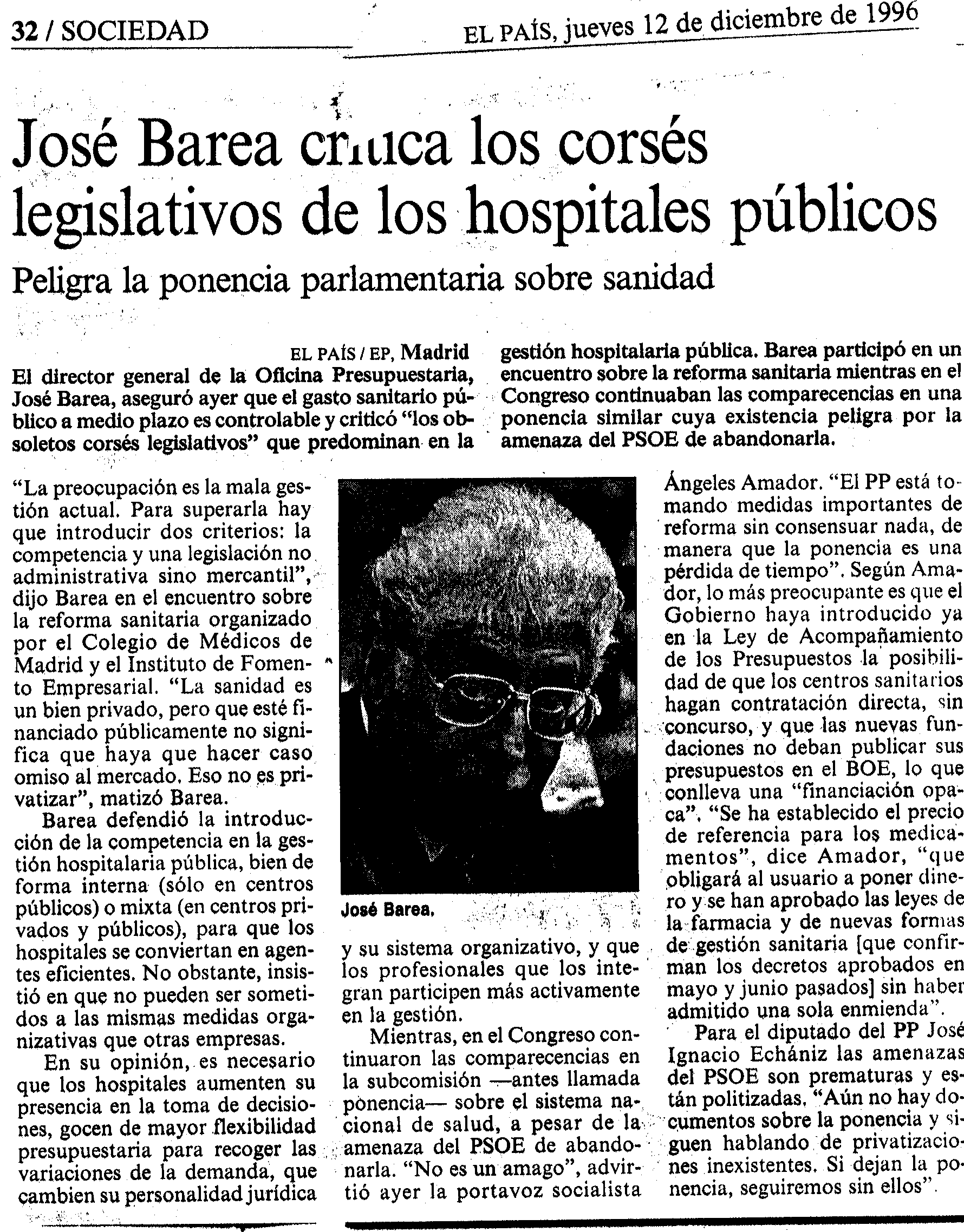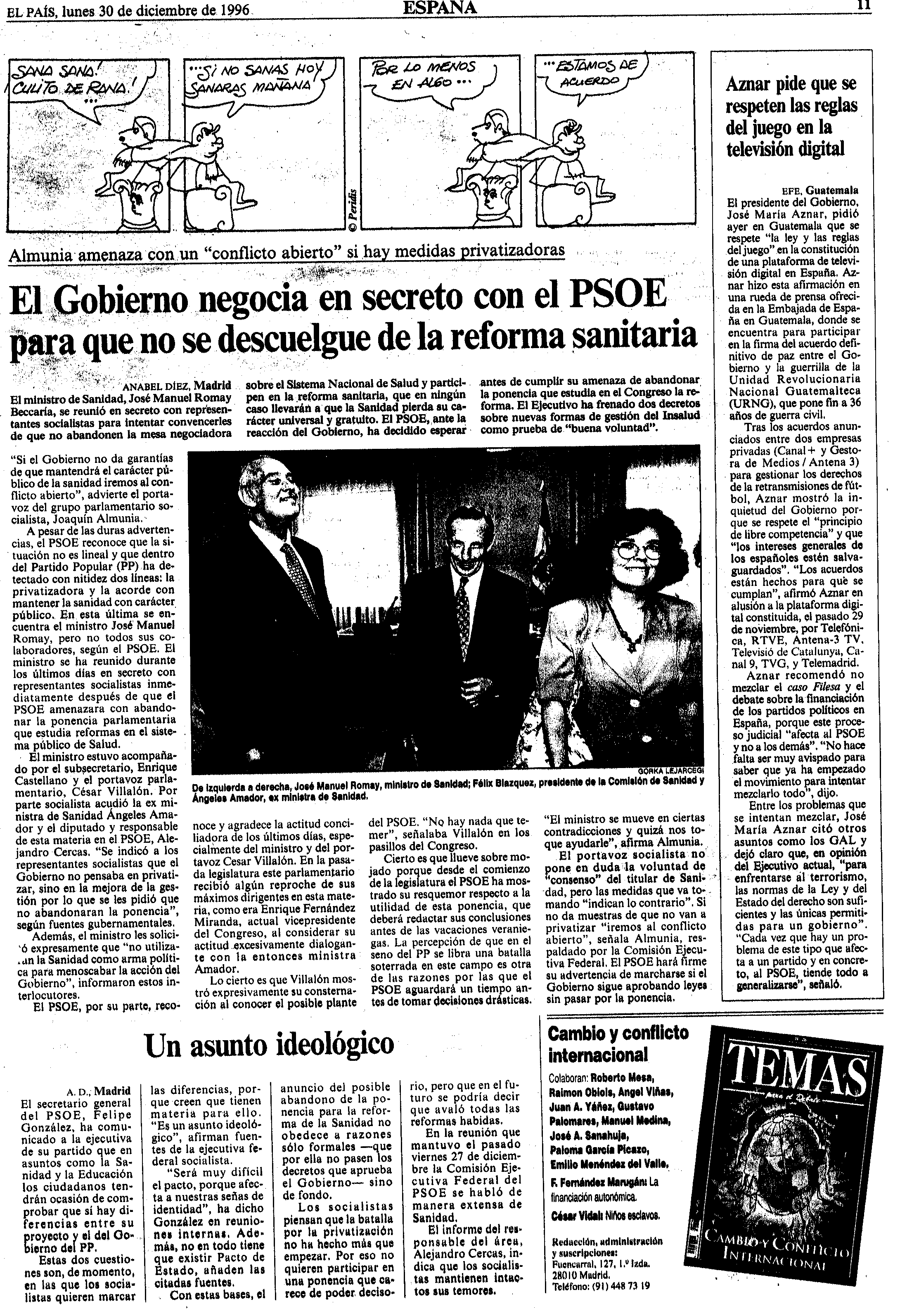 Además, los gerentes sanitarios de la última legislatura del PSOE serán especialmente sensibles a argumentos de racionalidad del gasto público y muchos, incluso, a la introducción de ciertos mecanismos de mercado en el sistema público, ya iniciados en los años precedentes. Desde esta cultura gerencialista (pretendidamente apolitica), el entendimiento con los nuevos politicos y gestores del area del PP no es demasiado complicado.