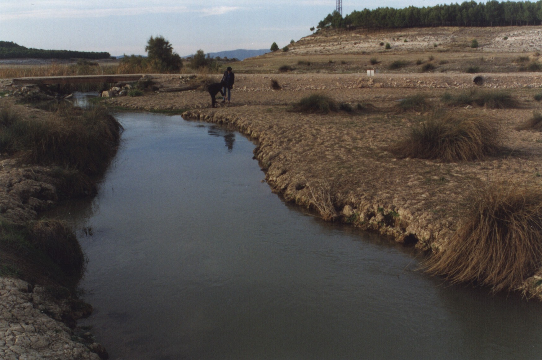 Río Mayor a la altura de la zona inundable de la cola del Embalse de Buendía. Al fondo: puentecillo de las Cañas y pinares del coto de caza de ICONA (1998).