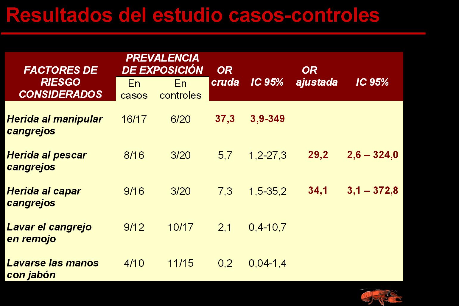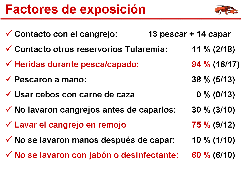 Todos los enfermos manifestaron contacto con los cangrejos, bien solo al pescarlos, 4 casos, bien solo al limpiarlos (caparlos), 5 casos, o bien al pescarlos y caparlos, 9 casos. Sin embargo, el principal factor de riesgo fue las heridas que los cangrejos infligieron a los casos, lo que representó un elevado riesgo de padecer Tularemia (73% de enfermos entre los que sufrieron heridas, frente a 7% de enfermos entre los que no recibieron heridas; OR= 37,3 ; IC 95%: 3,9-349). El riesgo era mayor si la herida se había recibido durante la operación de capado (OR ajustada= 34,1 ; IC 95% 3,1-373) que durante la pesca (OR ajustada= 29,3 ; IC 95%: 2,6-324). Se identificó Francisella Tularensis por PCR en estómago y hepatopancreas de cangrejos congelados pertenecientes a algunos casos.