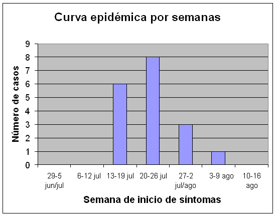 El estudio epidemiológico del brote de Cuenca identificó el tiempo epidémico (fechas en las que los casos iniciaron síntomas) entre el 16 de julio y el 4 de agosto de 1998, correspondiendo el territorio epidémico a un tramo de
