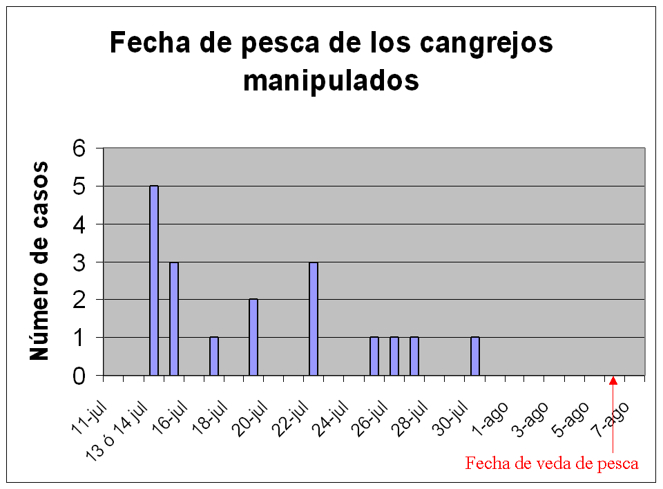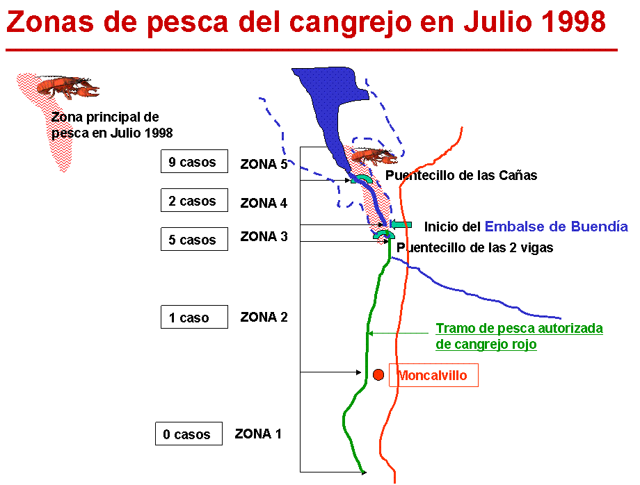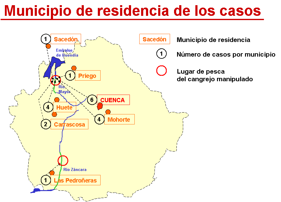 Todos los casos habían estado en contacto con cangrejos[1] pescados días antes, en el mencionado tramo de