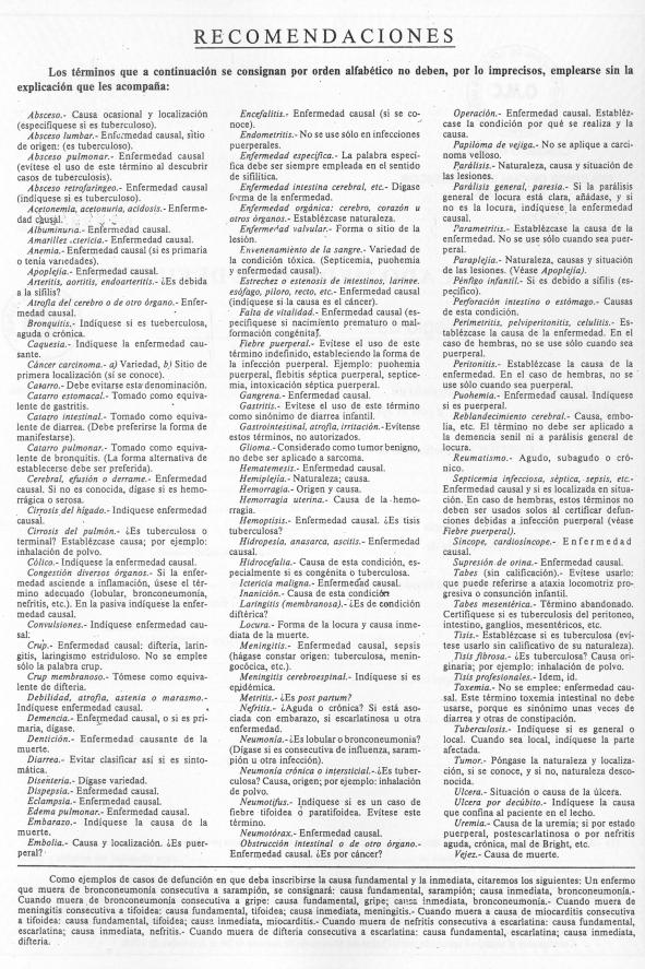 Dado que este modelo de certificado fue puesto en funcionamiento en 1958, la mayoría de los ejemplos que lo ilustran están basados en secuelas o complicaciones de enfermedades infecciosas ya no tan vigentes. En el reverso del certificado figuran en orden alfabético algunos términos que no deben ser empleados por su imprecisión.