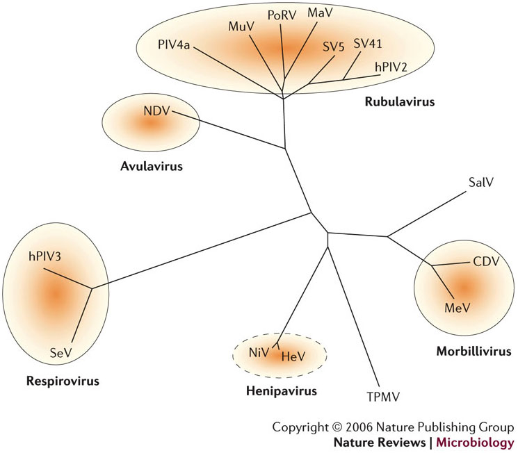 · Rubulavirus (virus de la parotiditis epidémica, virus parainfluenza humano tipos 2, 4a y 4b y virus de la enfermedad de Newcastle)