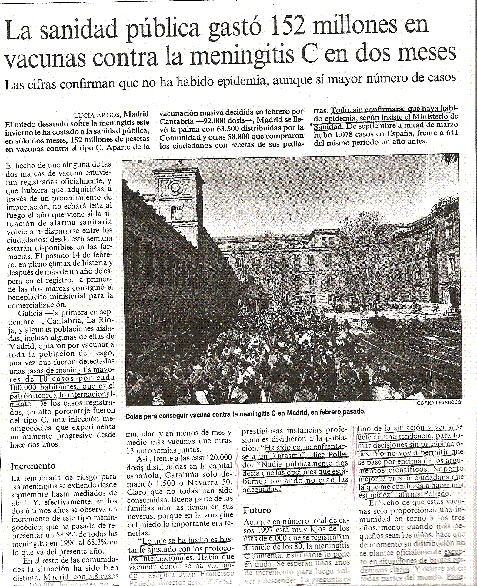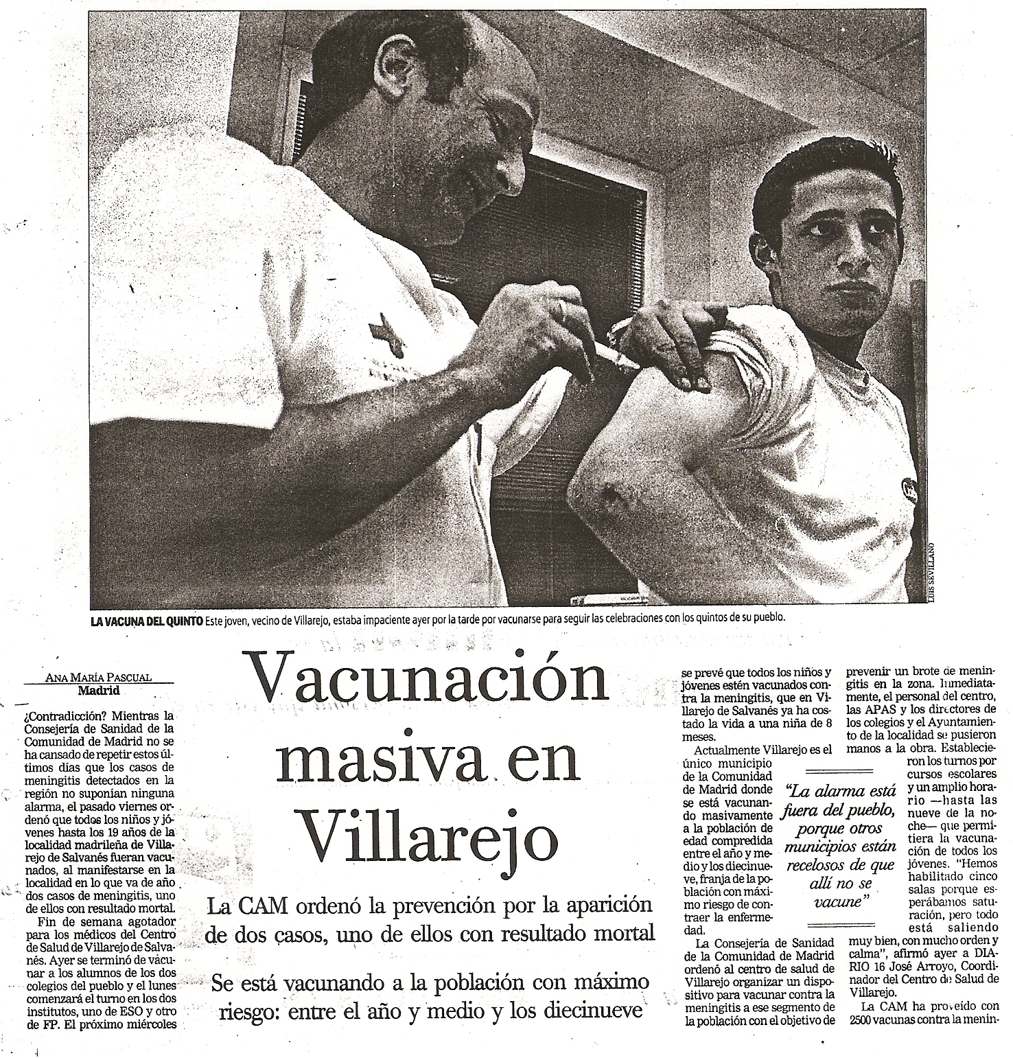 Como dijimos en la ultima entrega, muchos madrileños se enteraron por los periódicos que estábamos afrontando una situación extraordinario de riesgo de enfermar por meningitis C. Pero la alarma que provocó esta noticia, no solo se basaba en el numero de casos o muertos por esta enfermedad que se iban contabilizando, sino en la contradicción que se percibía entre el mensaje oficial, negando la necesidad de tomar ninguna medida extraordinaria, y el comportamiento de ciertos políticos, personajes públicos y sanitarios que empezaban a vacunar a sus hijos.
