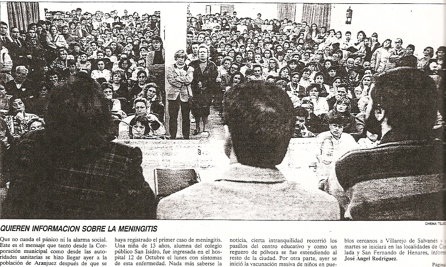 El Mundo, 28.02.1997. Epidemiologos ante una asamblea de padres en un colegio de Aranjuez  con un niño escolarizado y diagnosticado de  meningitis C