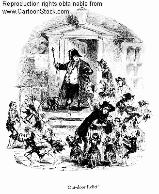 Grabado que representa el sistema de asistencia social a los pobres («outdoor relief») en la Inglaterra del XIX