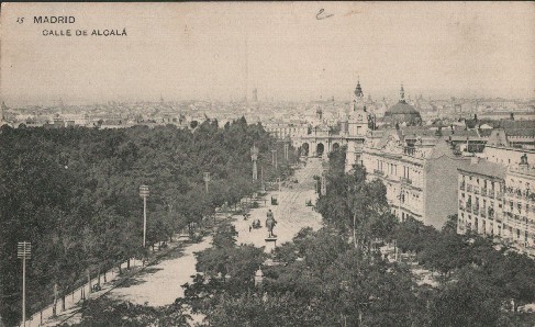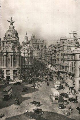 Dos imagenes del centro de Madrid: izquierda, una vacia calle de Alcalá a principios del XX; derecha, la rebautizada avda de Jose Antonio (Gran Via) en la postguerra. Fuente: www.oldpostal.com
