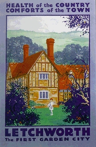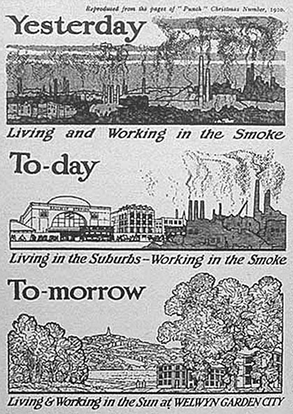 Izquierda: Anuncio de 1930 en la revista «Punch» de una «Ciudad jardin». «Ayer, viviendo y trabajando entre el humo; Hoy, viviendo en los suburbios y trabajando entre el humo; Mañana, viviendo y trabajando al sol en Welwyn Garden City. Derecha: Cartel publicitario «La salud del campo, el comfort de la ciudad. Leitchwoth, la primera ciudad jardin». Fuente: http://www.todoarquitectura.com/v2/foros/topic.asp?Topic_ID=33239