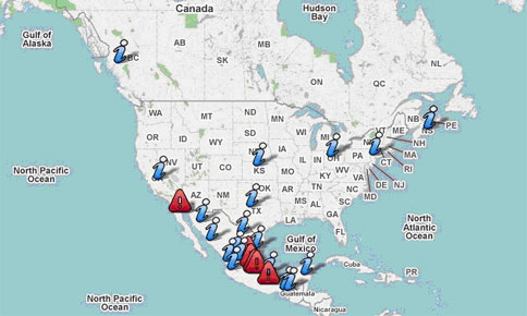 Resumen de los sitios donde han ocurrido defunciones (triángulos rojos) y casos confirmados (figuras azules).