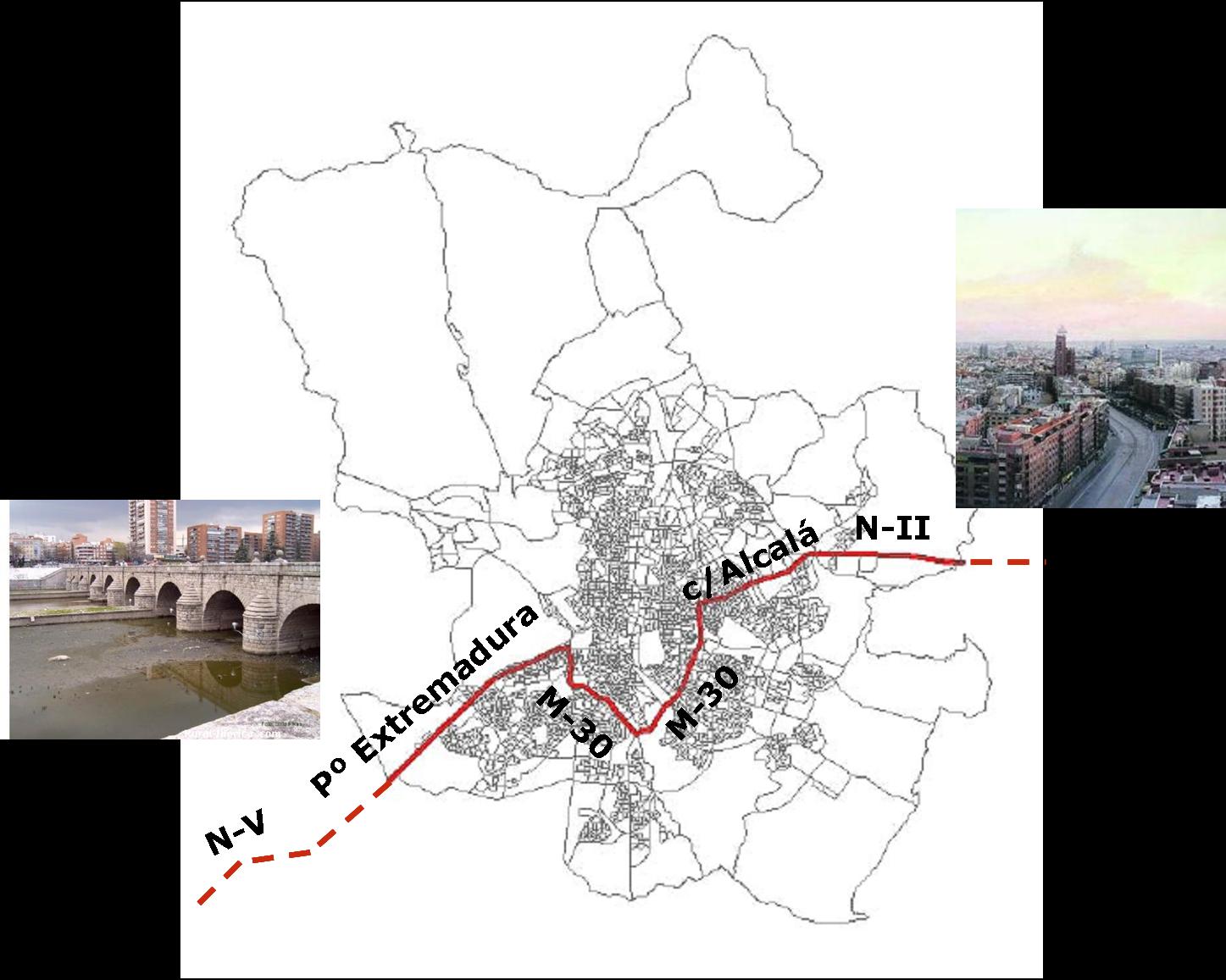 […] por el recorrido sur de la M-30 y sale por el oeste por la calle de Alcalá y la nacional II (ver “La linea de la pobreza”). Los barrios al sur de esa linea tienen peores indicadores socio-sanitarios, que los del norte, […]