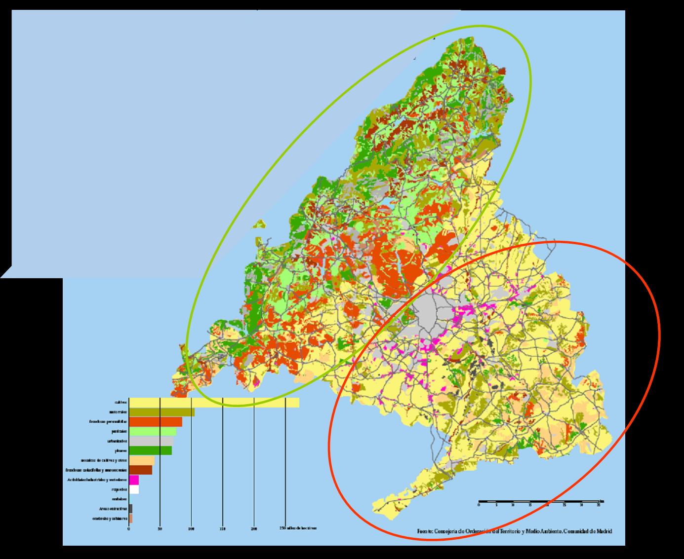 Mapa de vegetación y usos del suelo de la Comunidad de Madrid 1998. El circulo verde enmarca la zona noroeste de mayor valor paisajístico (en verde oscuro la vegetación de montaña, pastizales, enebrales, sabinares y pinares de la sierra, y en rojo anaranjado, las frondosas del pie de monte). El circulo naranja señala el área del sureste, menos valorado por su tipo de vegetación (cultivos, en amarillo, y matorrales) y el uso de su suelo (urbano en gris, industrial y vertederos, en morado). Fuente: Elaboración propia a partir del mapa de la Consejería de Ordenación del Territorio y Medioambiente de la Comunidad de Madrid.
