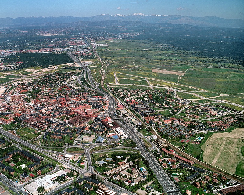 La autovía A-6 a su paso por el municipio de las Rozas, con sus tipicas urbanizaciones de chalets adosados. Al fondo se ve la sierra de Guadarrama. Fuente: www.navalcarbón.com