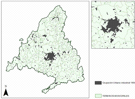 Ocupación urbano-industrial 1956: Madrid ciudad + provincia rural con islotes urbanos. Fuente: José Manuel Naredo. “Resumen de mi trayectoria intelectual…” Scripta Nova . Vol. XII, núm. 270 (156), 1 de agosto de 2008