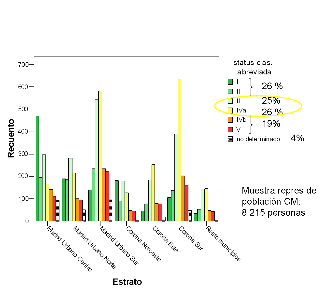 Si vemos su distribución en la CM, nos encontramos con lo que está reflejado en la figura 3, fruto de los trabajos de análisis de la Encuesta de salud de la CM de 2001. Esta analizó una muestra representativa de la población de la CM de 8.215 personas, resultando la siguiente distribución por clases ocupacionales: