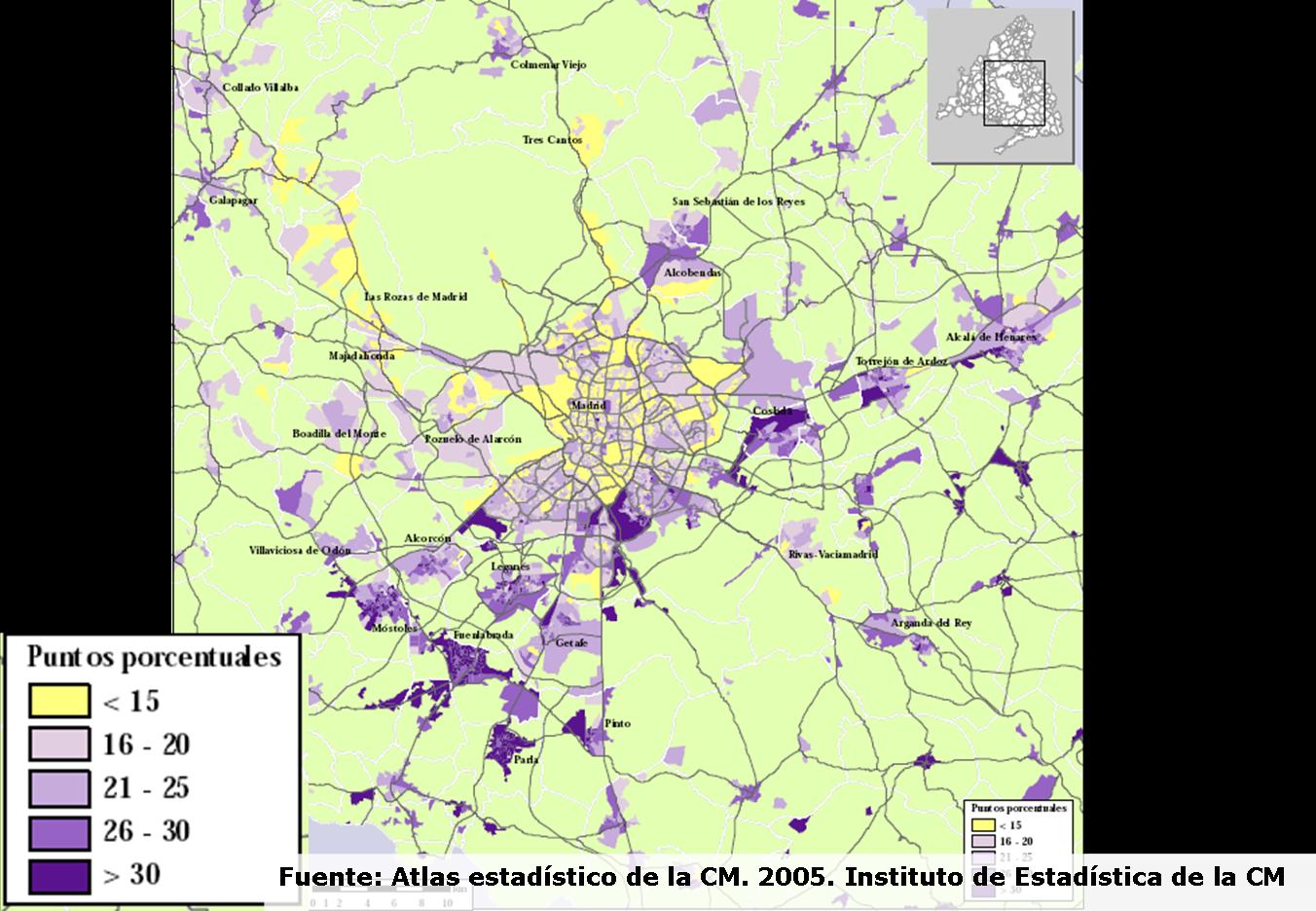 Mapa1: Diferencia (en puntos porcentuales) entre la tasa de actividad femenina y masculina. Comunidad de Madrid, 2001. Secciones censales. Fuente: Atlas estadístico de la CM. 2005. Instituto de Estadística de la CM. En morado oscuro se representan las secciones censales en que la diferencia supera el 30%, que se sitúan al sur de Madrid (distritos de Vallecas, Villaverde, Carabanchel) y de las ciudades del área metropolitana Sur (Mostoles, Fuenlabrada, Parla y Pinto) y este de la CM (Coslada y Torrejón de Ardoz), en cuyas familias hay una mayor proporción de mujeres que no trabajan fuera del hogar.