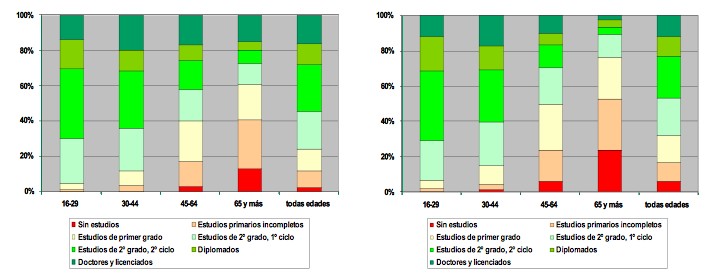 Figura 2: Educación: “efecto cohorte” y “efecto genero”. Nivel educativo por grupo de edad y sexo en la Comunidad de Madrid . En rojo, se representa la proporción de personas «sin estudios»; en verde oscuro, la proporción con estudios universitarios superiores (doctores y licenciados). Las cuatro primeras columnas en cada grafico, representan el nivel educativo en los grupos de edad de 10 a 29 años, 30-44 años, 45 a 64 años y 65 y más años; la ultima columna, a la derecha de cada grafico, representa el nivel educativo en el total de mujeres o de hombres. En las personas más mayores, la proporción de personas sin estudios es mayor y la de universitarios (de grado medio o superior) es menor; en el caso de la mujer, este gradiente es aún mayor. Fuente: Elaboración propia a partir de la Encuesta de Salud de la Comunidad de Madrid 2001 Consejería de Sanidad y Consumo