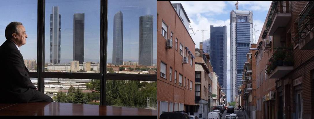 Figura 4: Paisaje a la llegada a Chamartin: a la izquierda, Florentino Perez, en su despacho de la constructora ACS, con el nuevo icono de Madrid, las Cuatro Torres, al fondo; a la derecha, contraste entre los rascacielos de las Cuatro Torres y viviendas próximas de clase baja del vecino barrio de Almenara-La Ventilla. Fuente: GORKA LEJARCEGI en www.elpais.com..