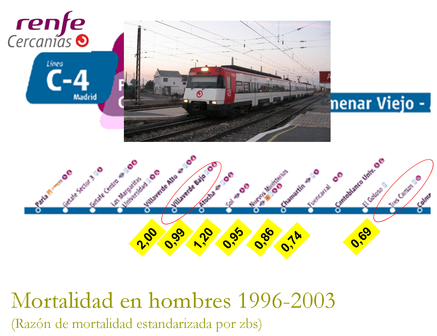 Identifiqué las zonas básicas de salud (zbs) que estaban próximas a las estaciones del trayecto. Del estudio de mortalidad del proyecto MEDEA (Mortalidad en áreas pequeñas Españolas y Desigualdades socio-Económicas y Ambientales), obtuve el valor de la tasa de mortalidad, seleccionando la mortalidad en hombres[2] en el periodo de estudio del proyecto (1996-2003)[3]. Como saben muchos de los lectores, cuando comparamos la mortalidad entre diferentes barrios, ciudades, países o poblaciones, tenemos que tener en cuenta el peso de la principal causa de muerte. ¿Sabéis cuál es? Los alumnos suelen contestar: cáncer, cardiovasculares, etc.… ¡NO! ¡¡¡La principal causa de muerte es la vejez!!!