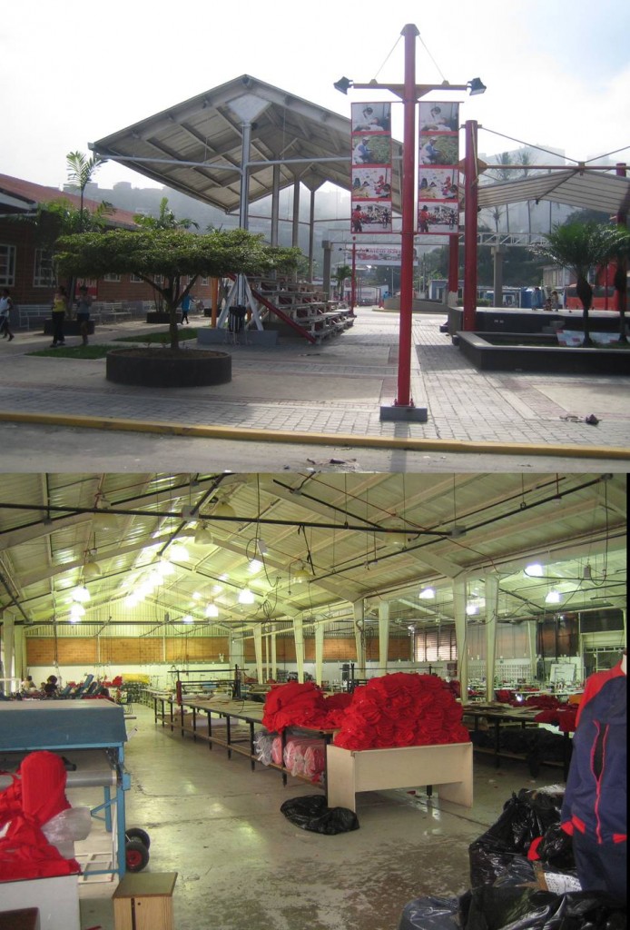 Interior de las instalaciones del nucleo endógeno. Arriba: plaza techada, con el edificio de la clínica popular a la izquierda; Abajo: interior de la cooperativa de confección textil de PDVSA. Fuente foto: Javier Segura, noviembre de 2011
