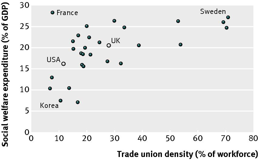 - Afiliación sindical. Los dos anteriores factores (pertenencia a organizaciones y políticas de protección social fuertes) están asociados estadísticamente en el caso de los sindicatos. En un estudio de los 29 países de la OCDE, se vio que la densidad sindical (el % de trabajadores afiliados a los sindicatos) esta positivamente asociada con el gasto social, medido en forma de presupuesto para atención sanitaria, pensiones, ayudas para la discapacidad, vivienda, políticas activas de empleo y otras políticas sociales[6].